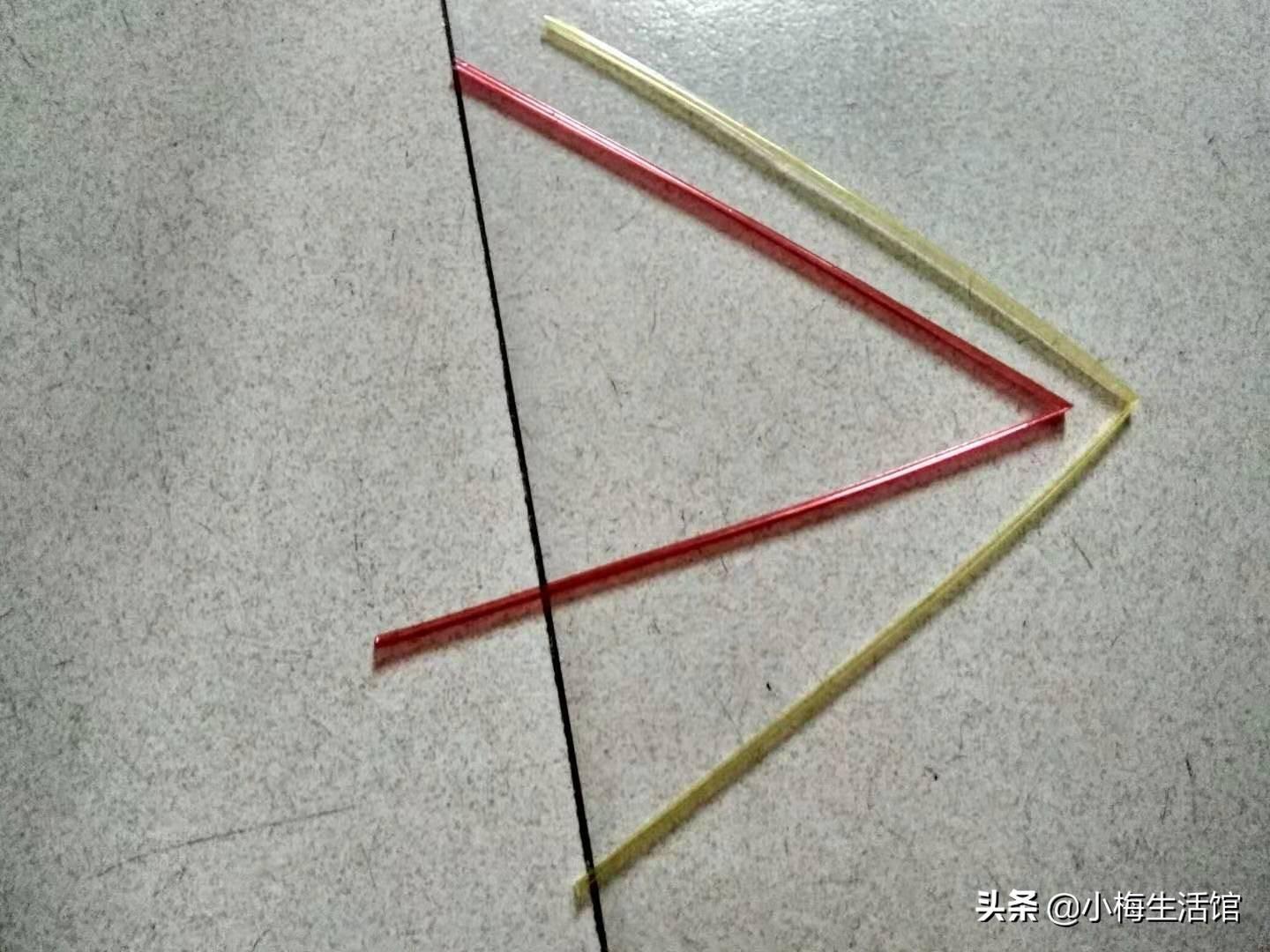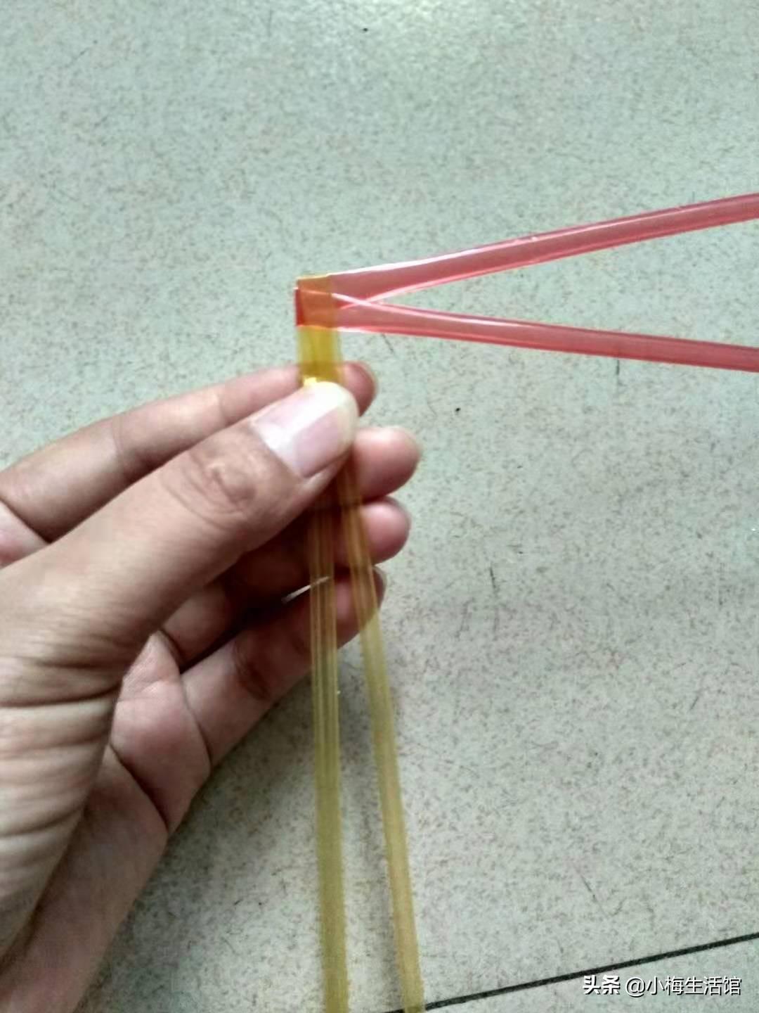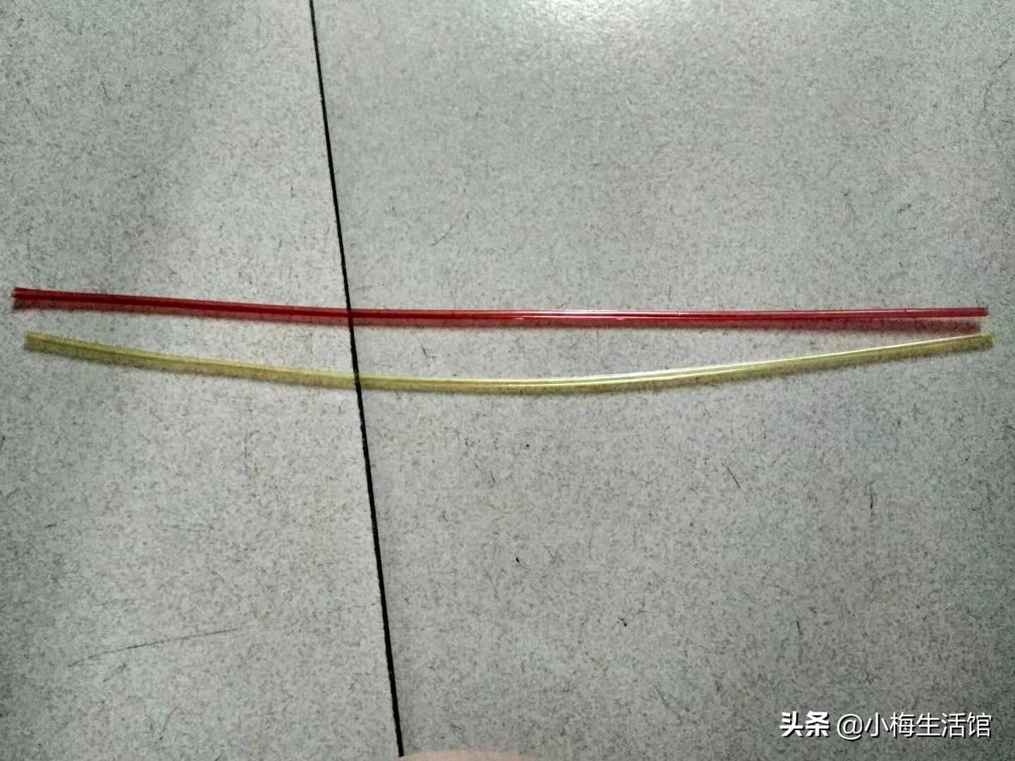 第一步:取两根塑料星星管,折中对折。我这里选取的是红色和黄色两种颜色的星星管,大家可以根据自己喜欢的颜色进行选取搭配,纯色也很好看的。