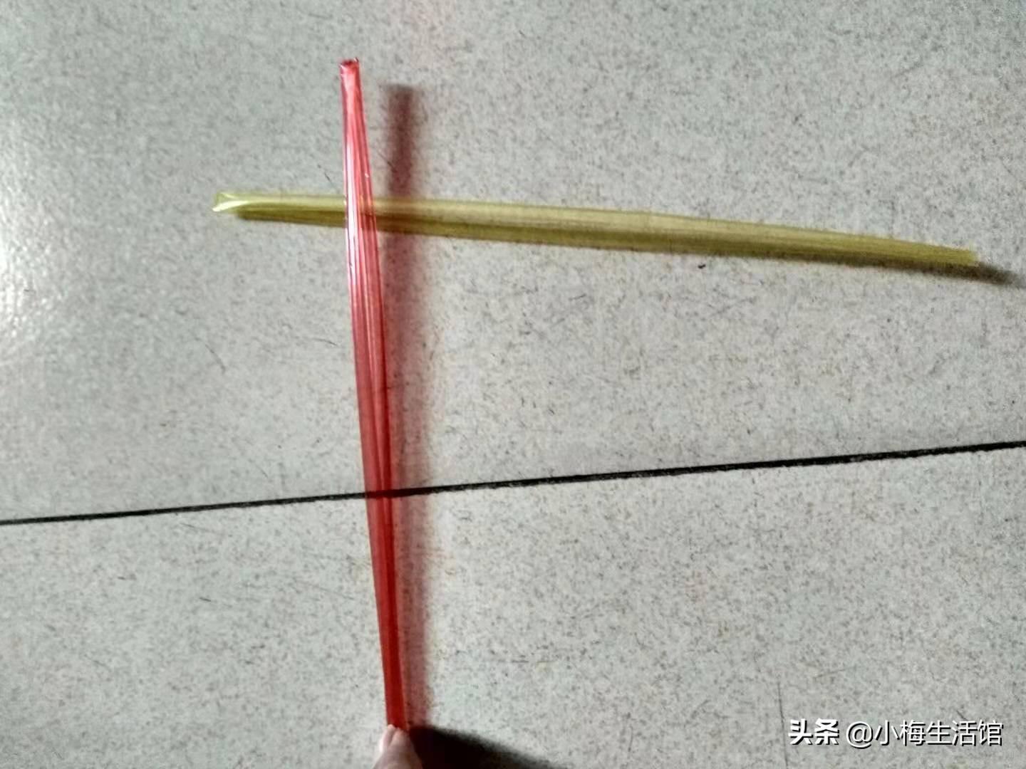 第二步:两根居中对折的塑料星星管相互交叉套好,黄色在下,红色在上,如下图所示。