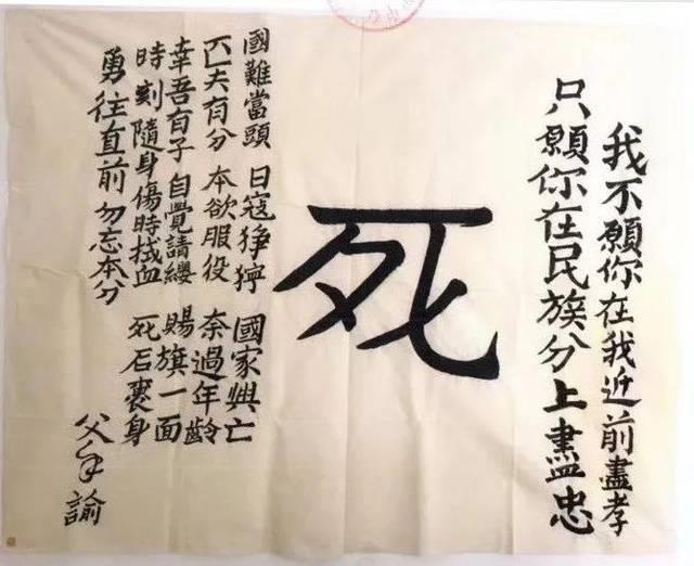 旗的左方写道:“国难当头,日寇狰狞。国家兴亡,匹夫有责。本欲服役,奈过年龄。幸吾有子,自觉请缨。赐旗一面,时刻随身。伤时拭血,死后裹身。勇往直前,勿忘本分。”