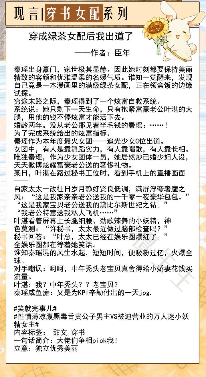 小短评:当豪门阔太太的女主忽然发现在自己是一本狗血漫中的炮灰前妻后,决定和男主离婚的同时,却被一个“女配炫富系统”给绑定,为了能赚取生命值,她只好改变计划,疯狂飙演技,当狗腿讨好老公来完成系统千奇百怪炫富任务的故事。简而言之,就是老公面前端庄贤淑,粉丝面前又飒又野的女主,在系统的神助攻下与相敬如宾,冷冰冷又很凉薄的男主婚后相恋。