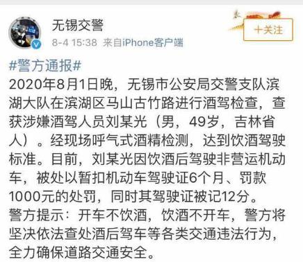 原来2020年8月1日晚,无锡市公安局交警支队滨湖大队在例行酒驾检查,没想查获涉到的嫌酒驾人员刘某光竟是大名鼎鼎的赵四。经现场呼气式酒精检测,达到饮酒驾驶标准,这下酒驾坐实了。目前刘某光因饮酒后驾驶非营运机动车,被处以暂扣机动车驾驶证6个月、罚款1000元处罚,同时其驾驶证被记12分。想想赵四喝酒后开车是怎么样的一种画风,尼古拉斯赵四真不是吹的。有网友说可能是四哥因为没了刘能一个人喝闷酒出去兜风解闷吧,也有人说四哥做什么事都要跟刘能争,这下终于出口气了。