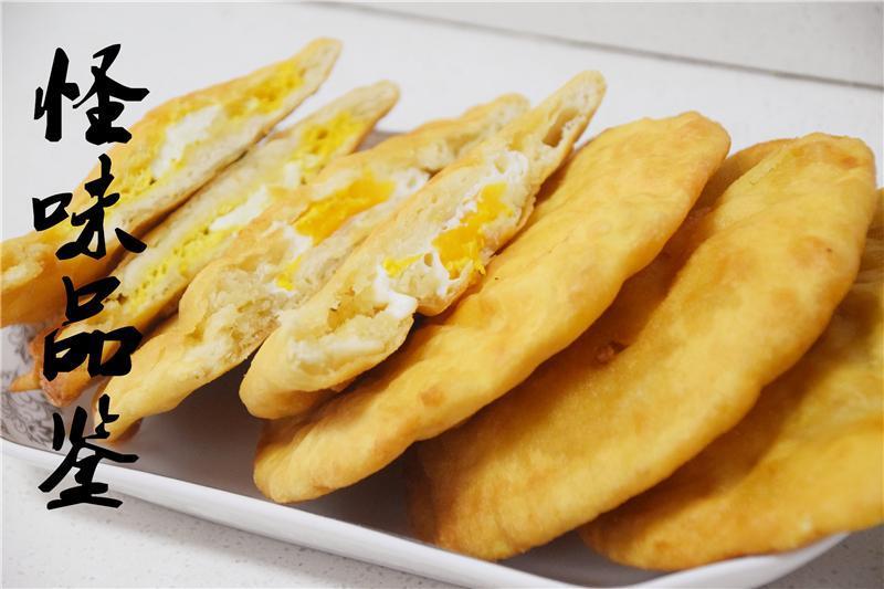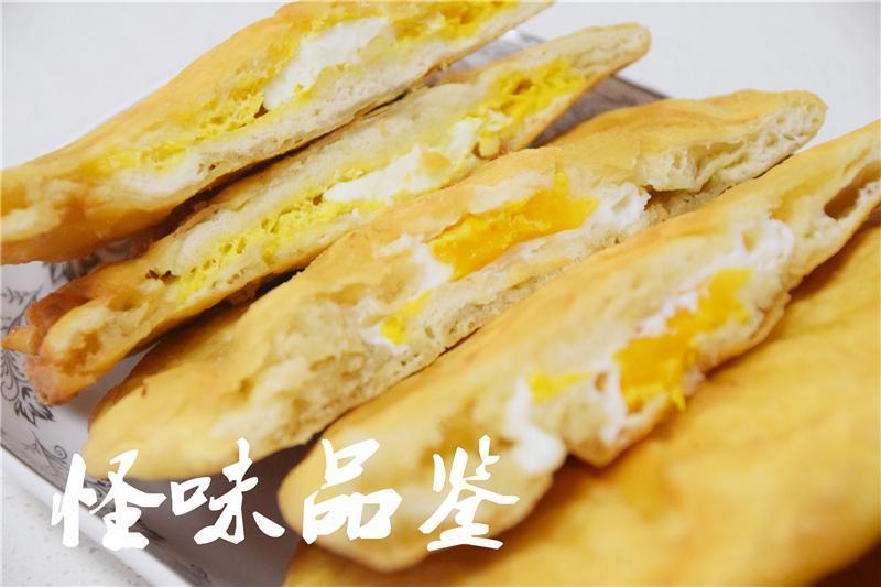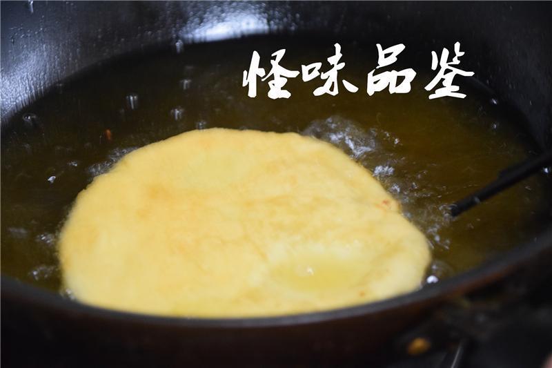 炸到鼓泡即刻捞出,稍微控一下油,然后顺着鼓起的饼边撕个小口子,把鸡蛋打进饼里,迅速封号饼边,再次下锅炸。第一次出锅时候的饼并没有炸熟,所以里面的面还是软的,可以再次封口的。