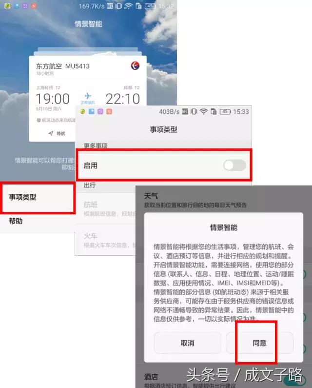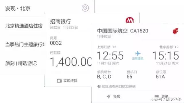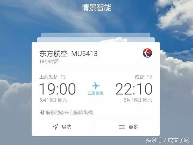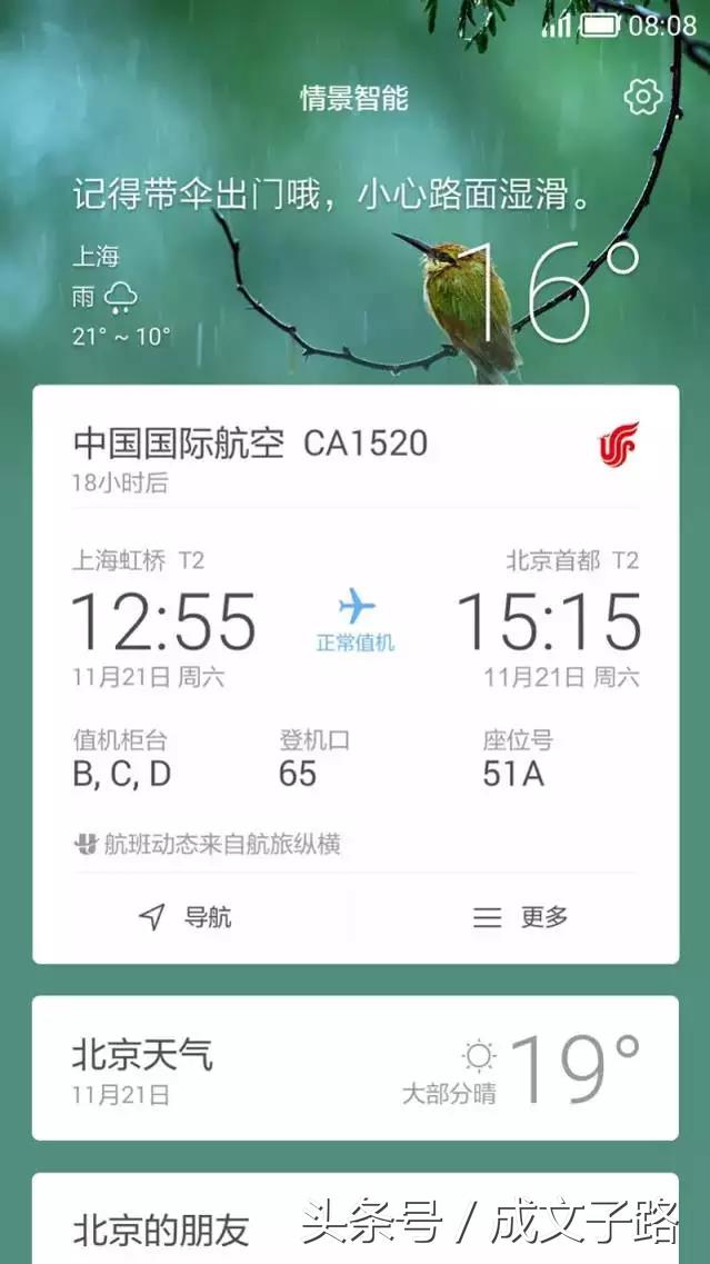 当我们定了航空信息的时候,智能情景就会提供卡片式的提醒