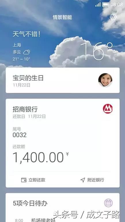 智能情景还能为我们提供上班出行,道路情况、会议提醒,了然于心;便捷生活,朋友生日、还款信息、待办事件,一刻也不耽误;