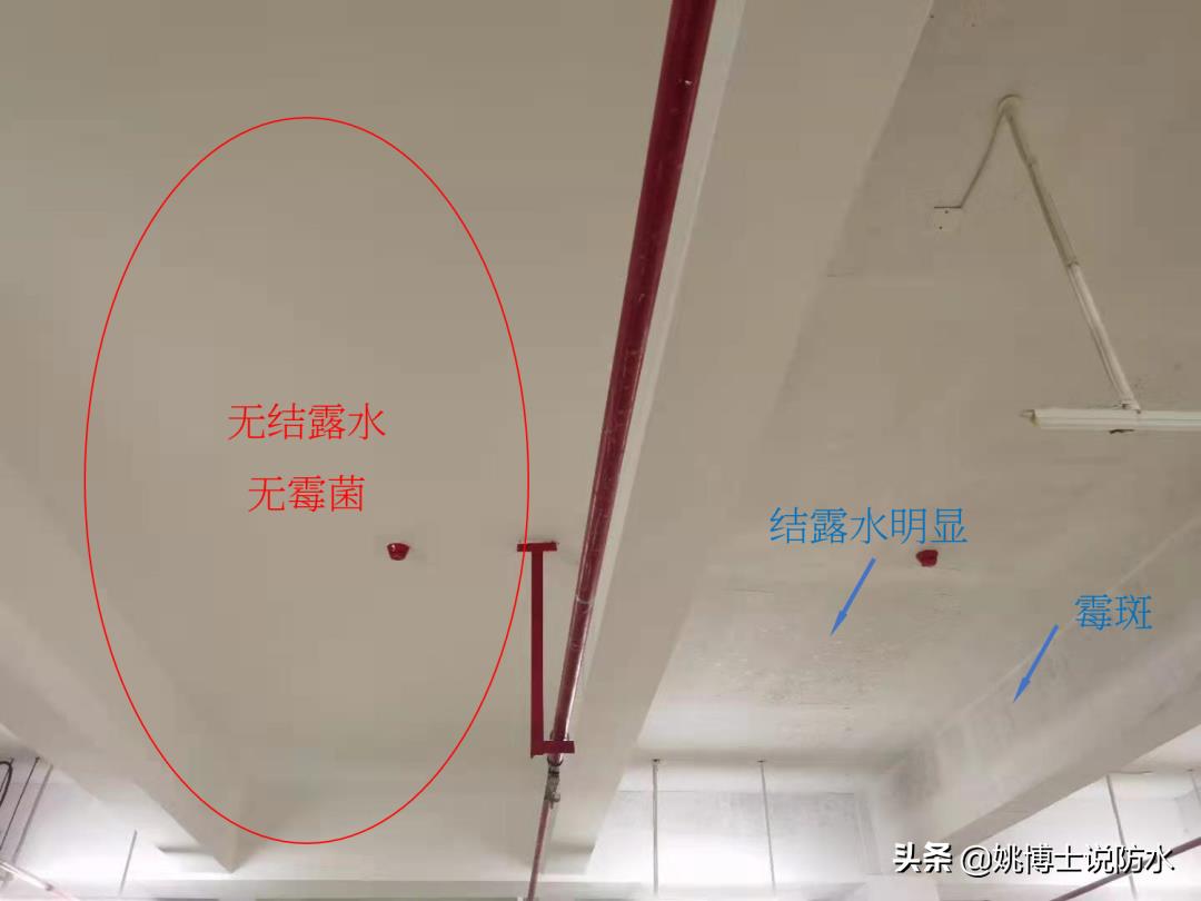 永康山水一品地下室防结露,效果反馈:施工区域干燥清洁,未施工区域,水迹明显,有霉斑。