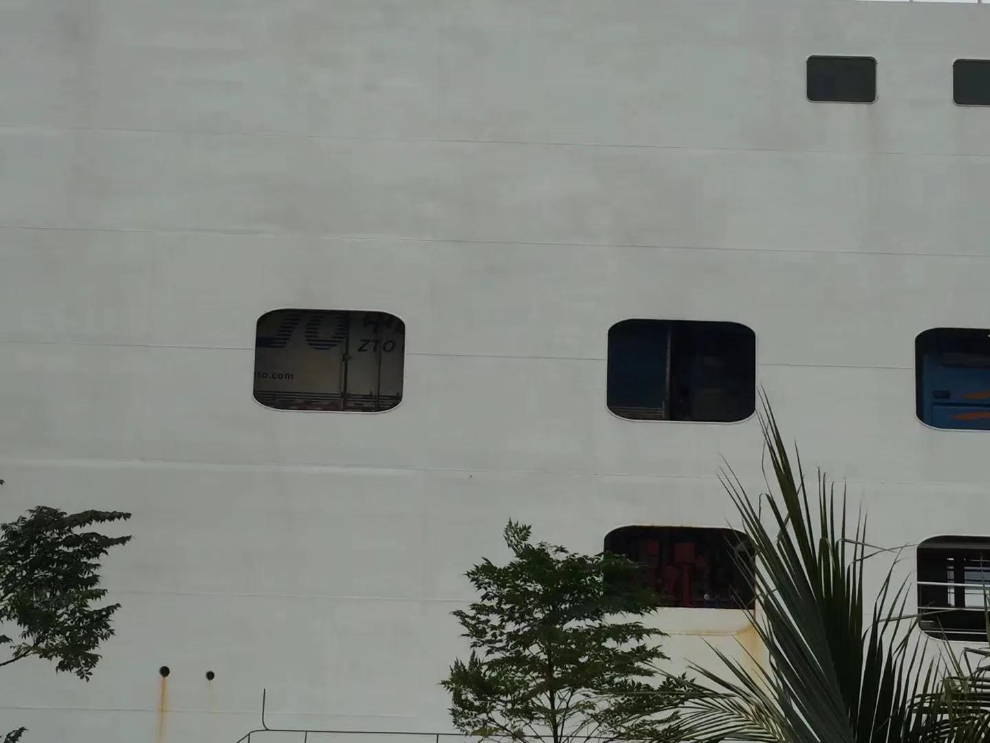 这是轮渡的侧面 可以看到三个层船仓的窗户 如果把照片放大 可以看到二层窗户内快递汽车