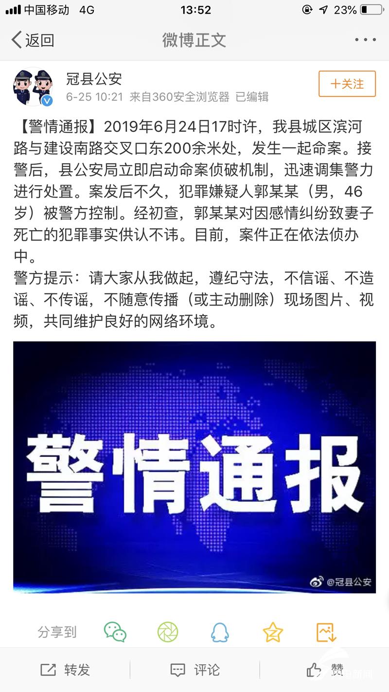 冠县城区发生一起命案!男子因感情纠纷致妻子死亡 目前已被警方控制