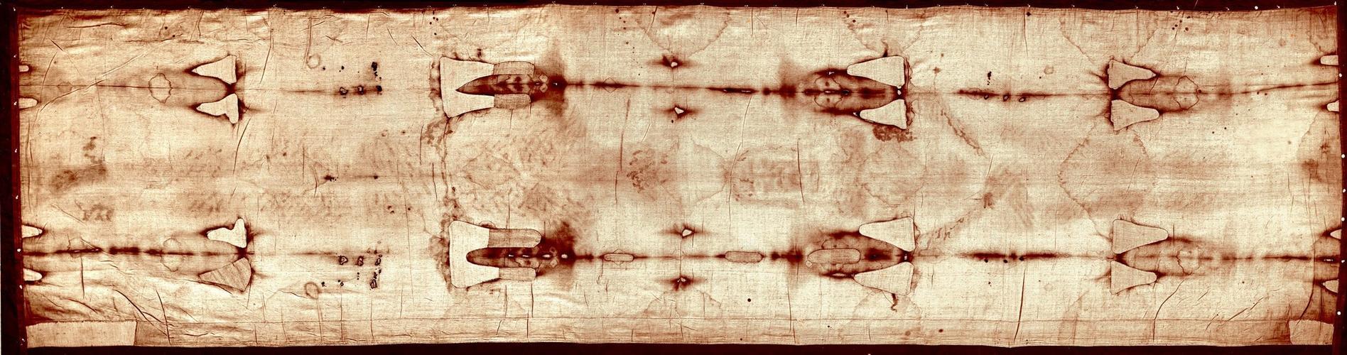 都灵裹尸布,一块亚麻布长约4.4米,宽约1.1米,呈薄纱状。这上面有模糊的人脸痕迹,以及手、头、背、足的血迹印记,显示了一个男子被钉在十字架上的情形。这些血迹印记异常清晰而栩栩如生,显示出惊人的细节,准确反映了罗马时代的受难刑罚过程,这块布被认为是用来包裹耶稣基督遗体。
