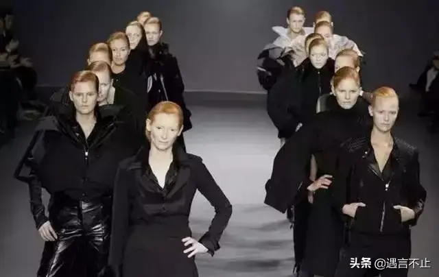 走秀那天蒂尔达领衔,带着一队超模秀出了自己同名的设计服装。