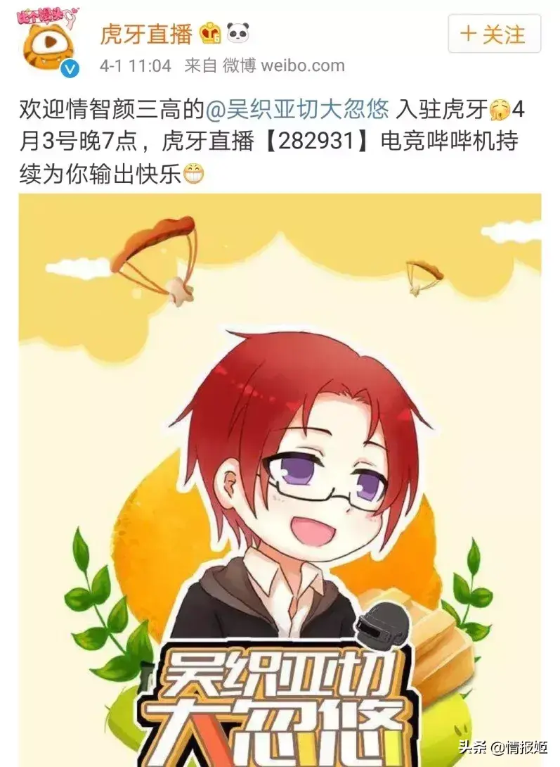 据虎牙直播官博的消息,曾b站知名up主及主播吴织亚切大忽悠现已入驻虎牙直播,并将在4月3号晚在虎牙开播。