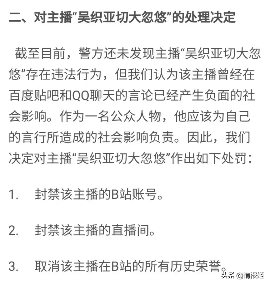 在2018年11月,吴织亚切大忽悠在微博、知乎和b站等平台的一些不当言论被人陆续曝光。其中就包括了涉嫌猥亵未成年少女的聊天记录,在贴吧上发布关于乱伦的言论,甚至还有他在微博上的一些声称要艹粉的发言。后来在各方对事件的关注和监督下,b站发出了对吴织亚切大忽悠的处理决定。