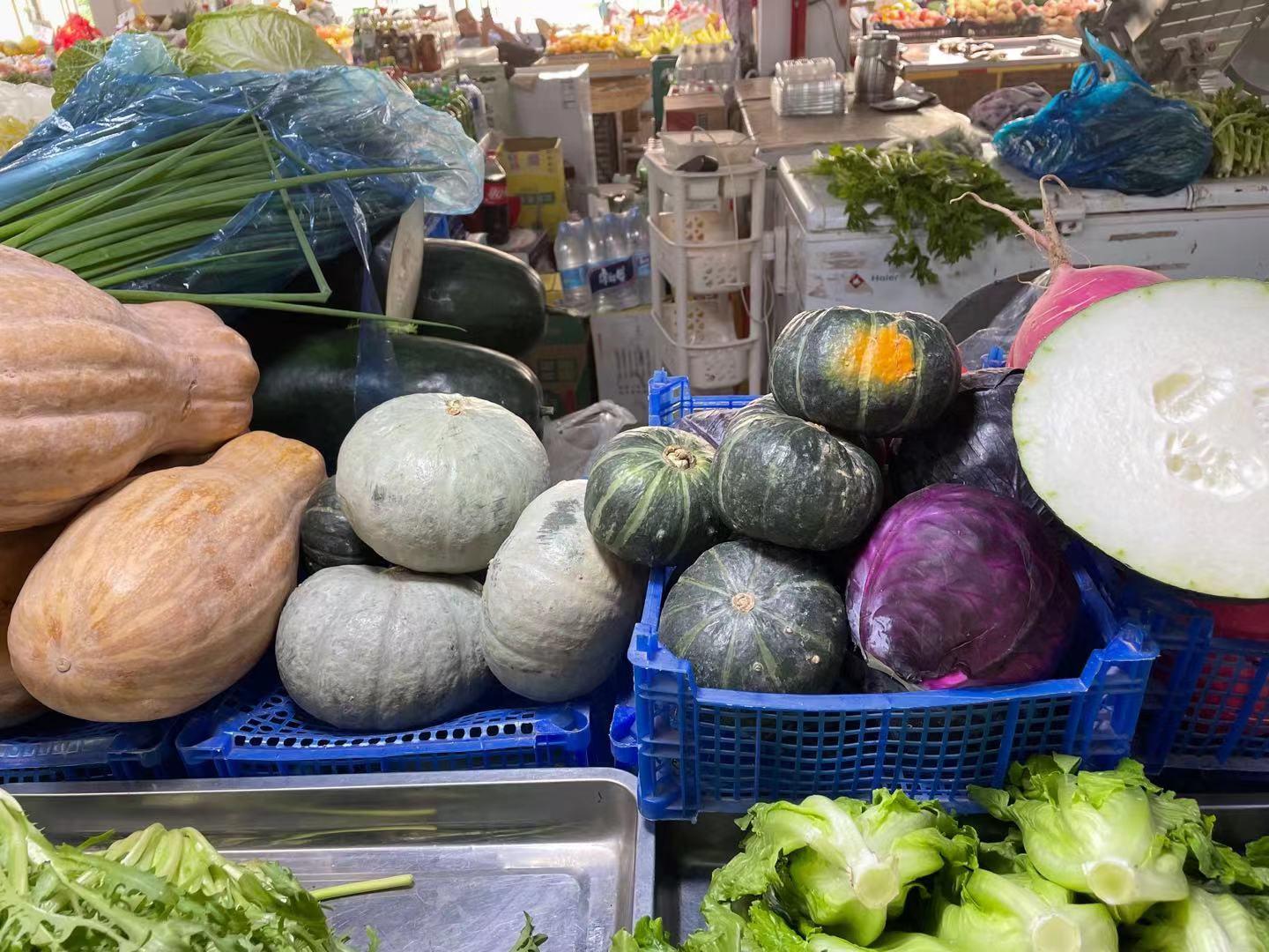 记者在这家菜摊上看到,南瓜、板栗南瓜、冬瓜等菜品摆放在一起。菜摊老板介绍说,现在的板栗南瓜有产自黑龙江和新疆的两种,目前新疆板栗南瓜4元一斤,等中秋前后至少得6元一斤,价高的时候还卖过10元一斤。老板表示,新疆板栗南瓜也叫银板栗南瓜,瓜皮偏白,是板栗瓜中口感最佳的,具有浓郁香甜的板栗味,质地比较干,吃起来更细腻。