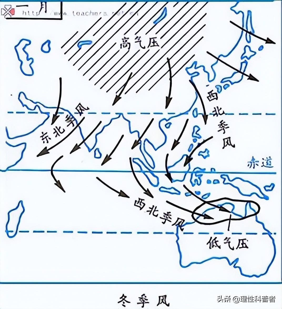 第二,在上述条件下,季风的方向还受到地球自转惯性的影响,地球自西向东转动,由于大气惯性的作用,季风的方向应该是大气合运动形成的。18世纪初,哈得莱指出:南亚地区阿拉伯海至印度的季风应该是夏季吹南风,冬季吹北风,实际观测到的却是夏季吹西南风,冬季吹东北风,就是由于夏季气流从南半球跨越赤道进入北半球时,受到地球自转效应影响,气流会受到一个向右的惯性力(叫地转偏向力或者叫科里奥利力)作用。