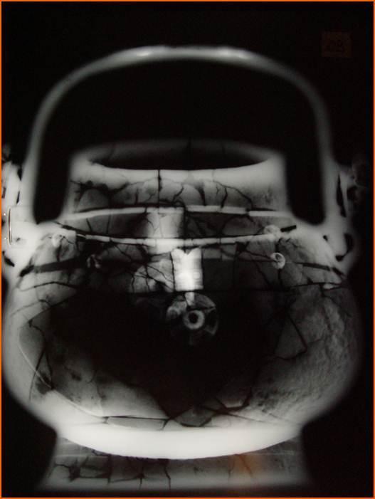 可探索部分器物的制作工艺、病害程度等情况,揭示文物的制作工艺特征、内部缺陷分布特征;可提取文物表面被覆盖或污染的文字、纹饰等信息;反映和记录文物修复前、后的内部详细情况;提供文物各种内部信息,作为鉴别真伪的参考依据;辅助了解文物内部病害的发展状况;寻找难以打开的组合和连接方式;帮助考古现场提取物的探测检查,指导清理方法;古代化石的探测分析。用X射线探伤仪,能发现文物上许多肉眼看不见的东西,比如器物内部的锈斑、比如表面的细小裂缝……所谓千里之堤溃于蚁穴,及时发现文物上存在的小问题,才能避免造成更大的损失(图五)。