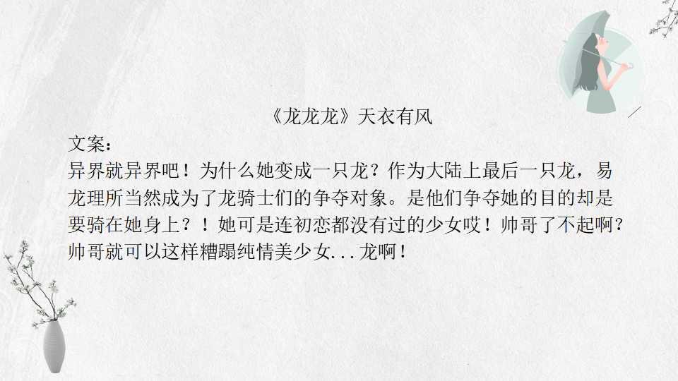 小w推荐理由:一句话简介,少女龙的异世界历险记。易龙龙穿越西幻背景异世界,成为世界上最后一条幼龙,很可爱的一篇文,女主乐观坚强,享受孤独,前面一人生活,看着治愈又舒服,现在看该文仍趣味十足。文风少女、中二、温暖,逻辑自洽,人物饱满,非常温馨的一篇小说,值得反复看。