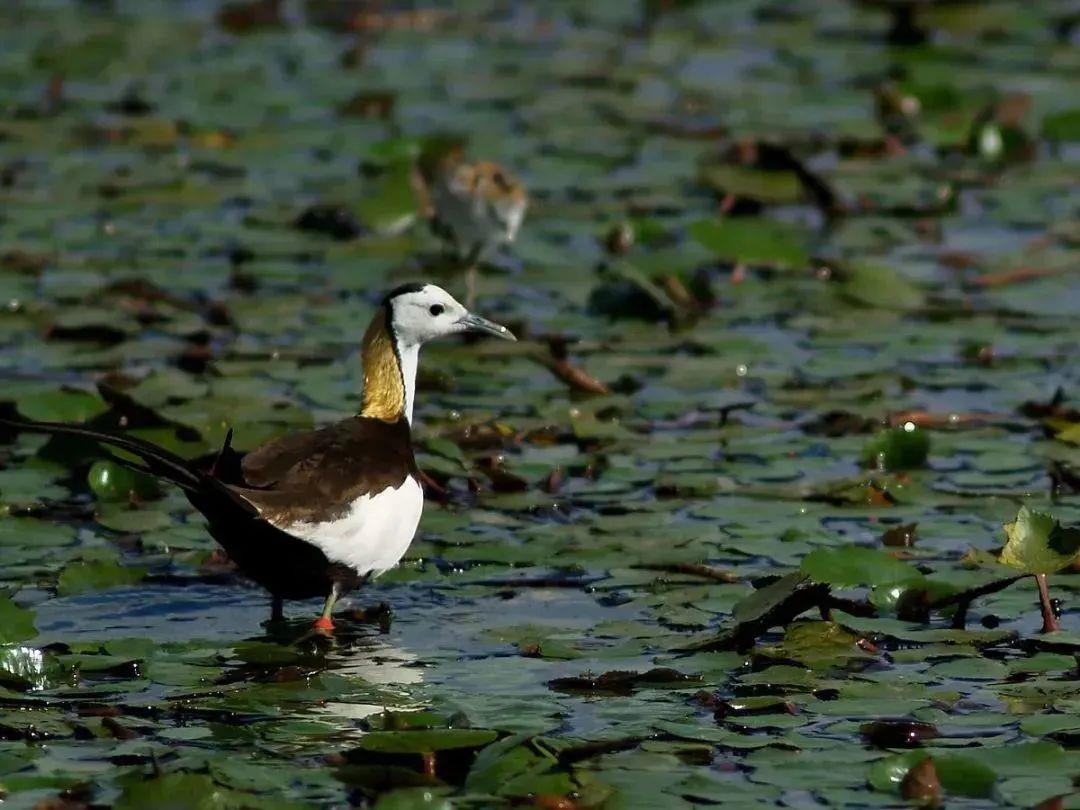 水雉经常出没于菱角之上,又被人们称作菱角鸟、凌波仙子。而自带小气囊的菱角,即使被水雉的大爪子踩过,也不会沉到水底|Alnus / wikipedia