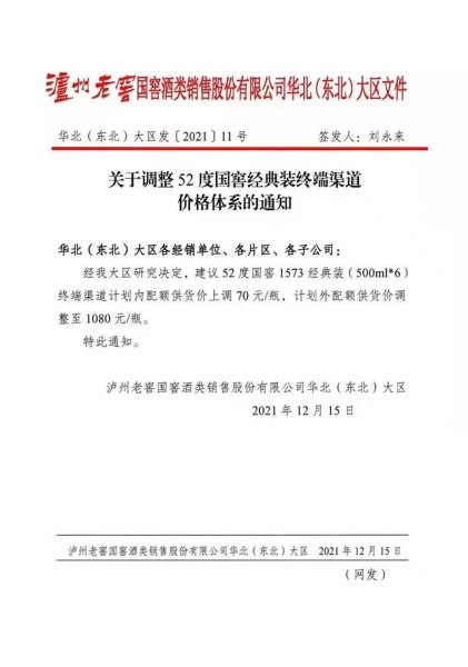 消息显示,12月15日,泸州老窖国窖酒类销售股份有限公司(下称“国窖销售公司”)向华北(东北)大区发出涨价通知,52度国窖1573经典装终端渠道计划内配额供货价上调70元/瓶,计划外配额供货价调整至1080元/瓶。38度国窖1573经典装终端渠道计划内配额供货价上调40元/瓶,计划外配额供货价调整至750元/瓶。