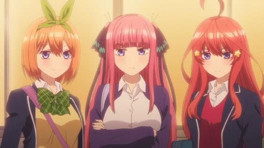 如果没看过漫画的动画党应该也知道在最新的一集中,风太郎在林间学校中的试胆大会上变装,从而和二乃产生误会,二乃对化名成金太郎的风太郎一见倾心。在漫画作品中,最后二乃也会和风太郎解开误会(其实就是爱上风太郎了,呜呜)。那么五胞胎其实已经攻略了四个了。一花,三玖早就被攻略了,五月是风太郎的女神,二乃也对风太郎产生好感。剩下的就只有四月,但是不管从动画还是漫画来看,比起恋爱对象,四叶更像是把风太郎当成好朋友。