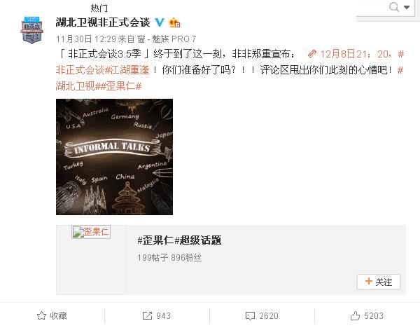 早在11月30号的时候,非正式会谈的官网就公布,新的一季《非正式会谈》要回归了,而且是定在了12月8号晚上9点播出。此消息一出后,立刻引来无数非迷的讨论,确实是的,大家都非常期待新的《非正式会谈》到来,因为似乎缺少了这个节目的周末,会有点儿小小的寂寞。