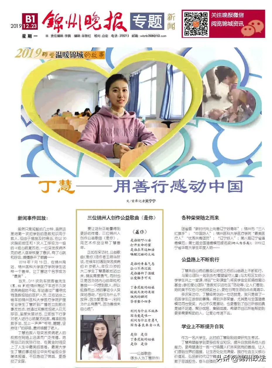 正如在采访时,公益歌曲《是你》词作者王照华所说,在候车时遇到突发疾病的81岁老人,年仅20岁的大二学生丁慧勇敢地站出来,确实需要勇气,同时也正是因为她内心的单纯和善良——只想到救人,所以挺身而出。她的事迹令人深深地感动。“别问为什么不放弃,因为爱是唯一;别问为什么有勇气,因为善良来自心底”。