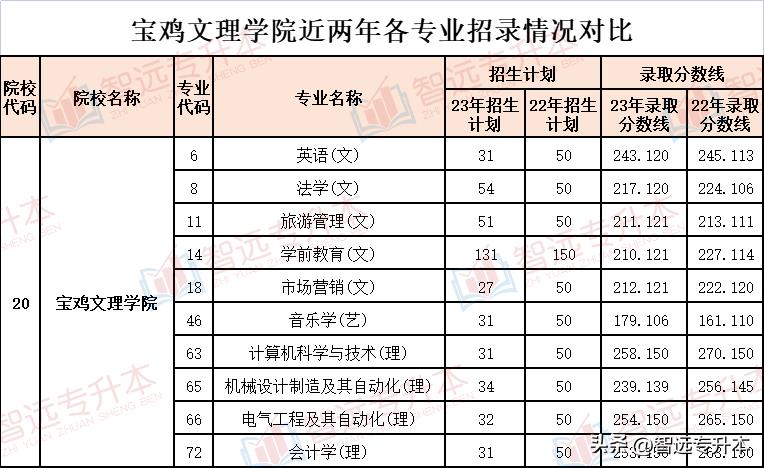 宝鸡文理学院在2023年专升本招生中,共计招生专业10个,其中文史类5个,艺术类1个,理工类4个。较去年相比减少了2个艺术类专业招生。