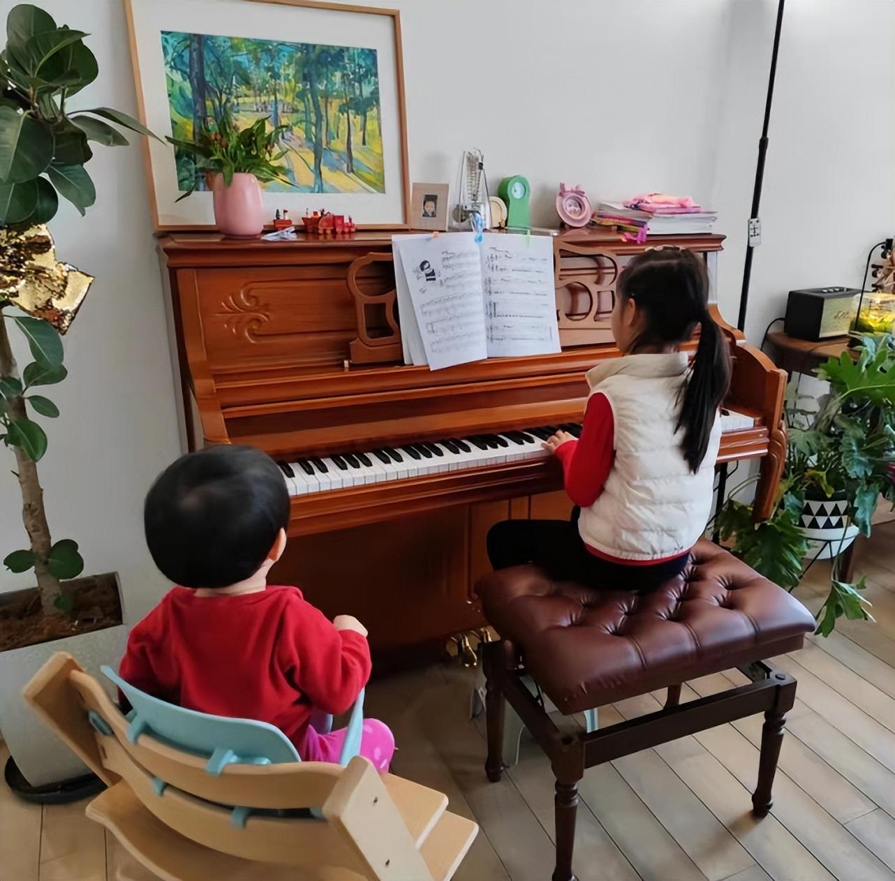 第二张照片里则是胖妹和妹妹入镜,胖妹扎着高马尾,穿着红色上衣搭配白色棉背心,相当保暖。小妮子背对镜头弹钢琴,坐姿端正,弹钢琴的姿势也十分熟练、优雅,哪怕不露正脸,依旧抢镜十足。不得不说,张梓琳和老公聂磊真的将女儿培养得好好,才6岁的胖妹就已经学会了自己弹钢琴,超棒。
