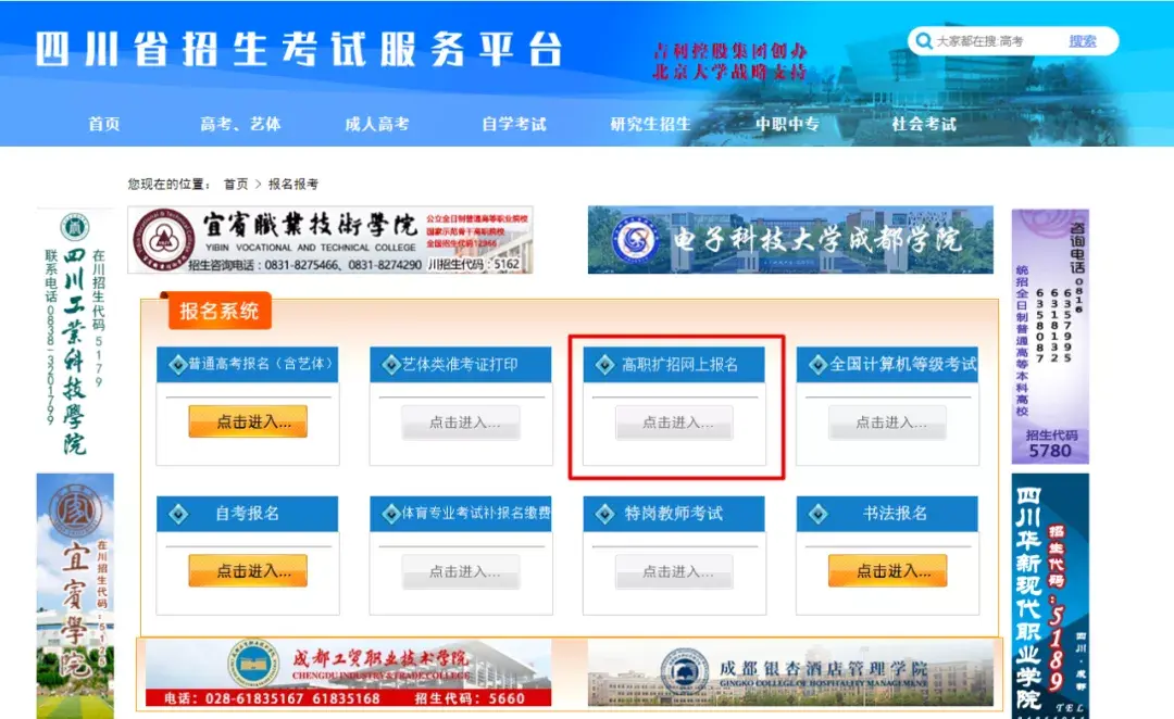 登录四川省教育考试院官网(https://www.sceea.cn),进入以后点击“招生考试服务平台”。