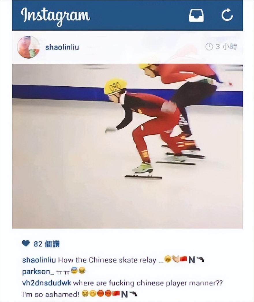 2年前刘少林在INS上发布的疑似“辱华”的言论也被扒出,当时刘少林用英文写道中国人这么滑接力的,后面紧跟着一个笑脸、一个鼓掌、一个中国国旗、一个N以及一把手枪的表情。