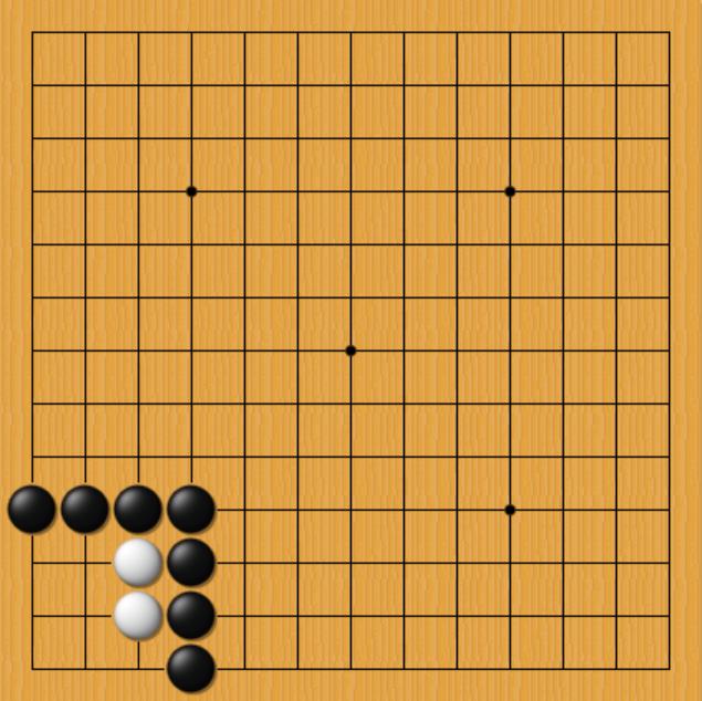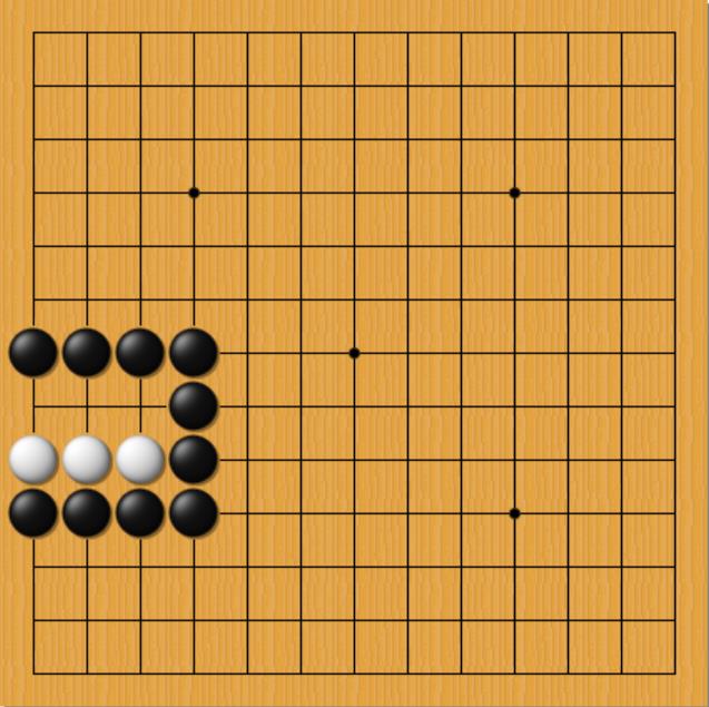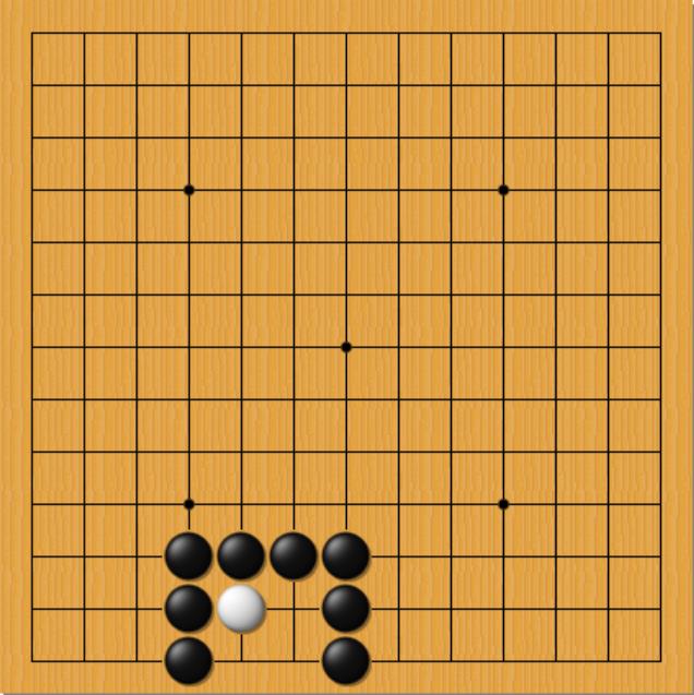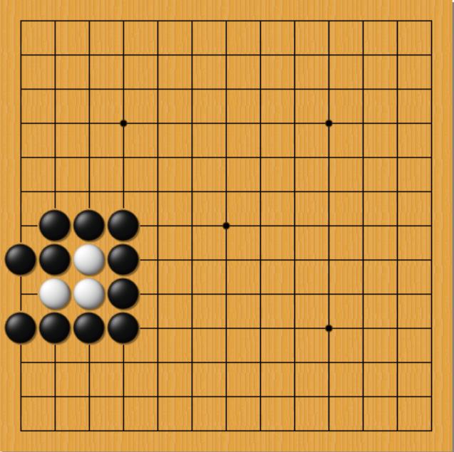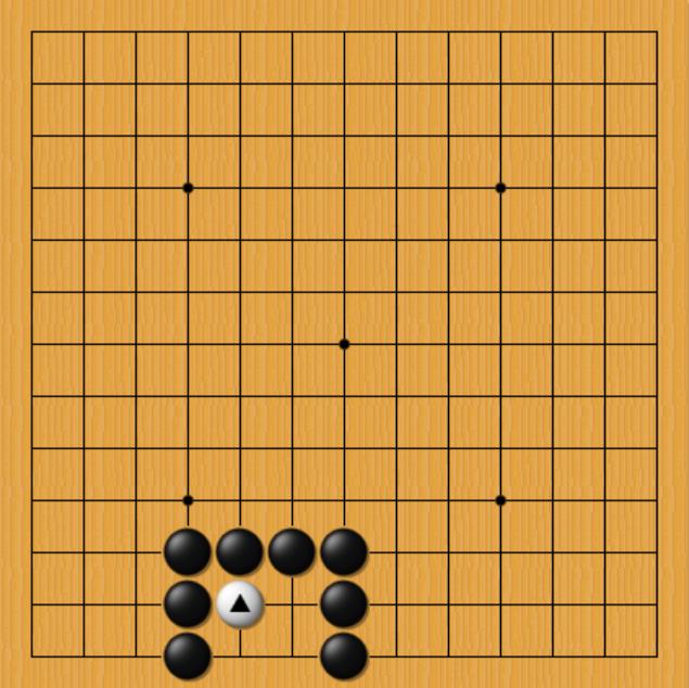 图2:上图中若没有白△一子,很容易知道黑棋有4目(围住了四个交叉点),那多了白△子之后会产生什么样的变化呢?其实计算的方法很简单,因为白△子已经无法做活或者逃跑,视为死棋,那么在计算黑棋的目数的时候,只需要在原有的目数基础上上增加吃掉对方棋子的数量,即为黑棋总共的目数。