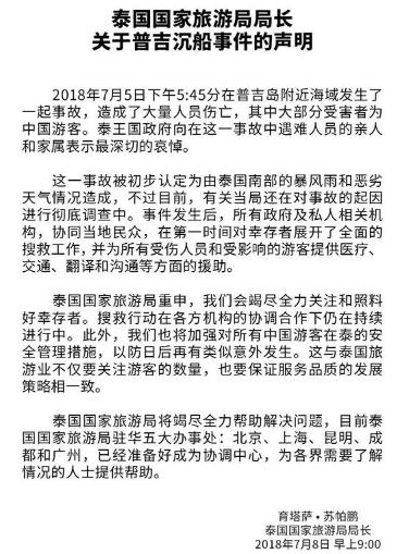 普吉府府尹诺拉帕介绍,泰方搜救人员8日将主要展开潜水救援以及海面和空中搜救。普吉府已经向相邻的甲米府和攀牙府提出协助请求,扩大搜救范围。