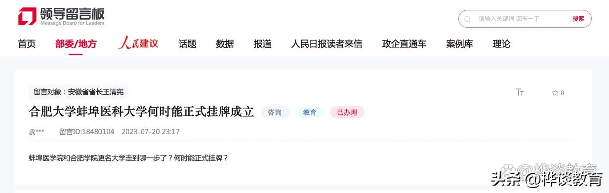 近日,安徽省教育厅在回复网友提问、蚌埠医学院和合肥学院更名进展、何时挂牌时称:…蚌埠医学院更名大学、合肥学院更名大学均已向教育部申报且经全国高评委专家组考察。下一步,省教育厅将继续对接教育部,跟进审批进展。