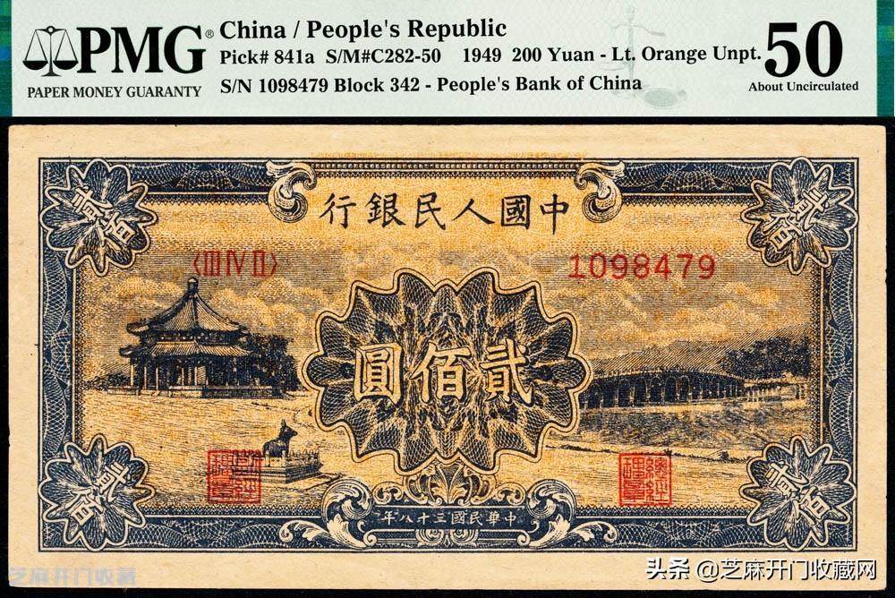 1:民国三十八年(1949年)第一套人民币“颐和园”贰佰圆,PMG 50,估价: RMB 无底价,成交价格: RMB 51750