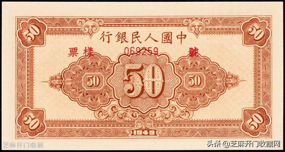 5:民国三十八年(1949年)第一套人民币“工农”伍拾圆,六号码,票样,PMG 66 EPQ,成交价格: RMB 24150