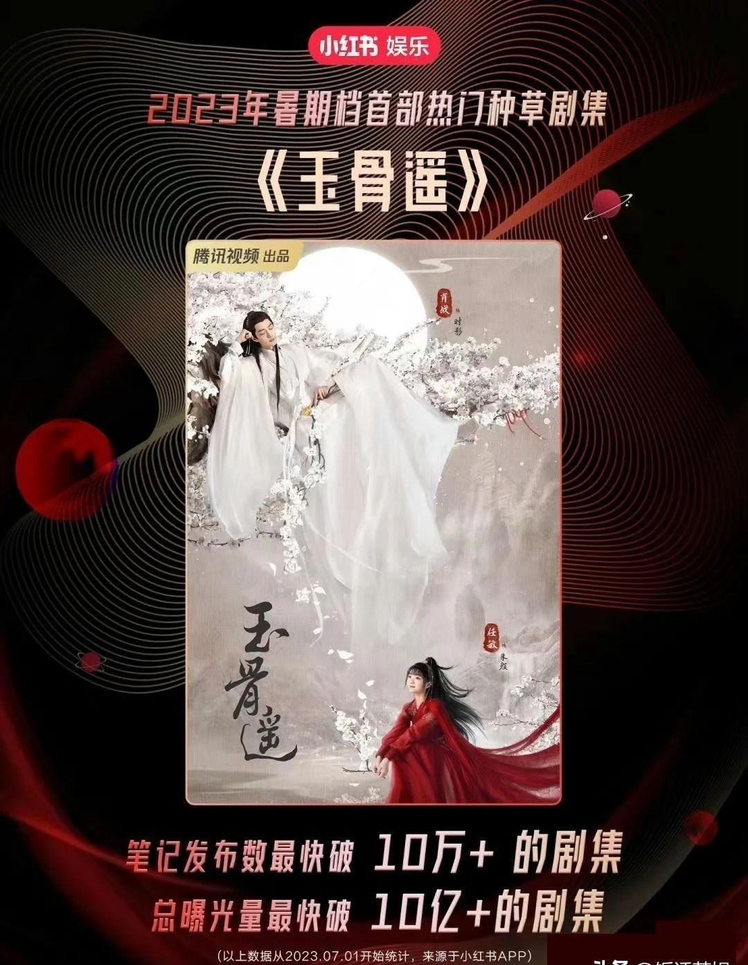 另一个是上浮市场小red书(种草女性用户偏多的平台)也给《玉骨遥》发了战报:2023年暑期档首部热门种草剧集,笔记发布数量最快破10万+,总曝光量最快破10亿+的剧集。