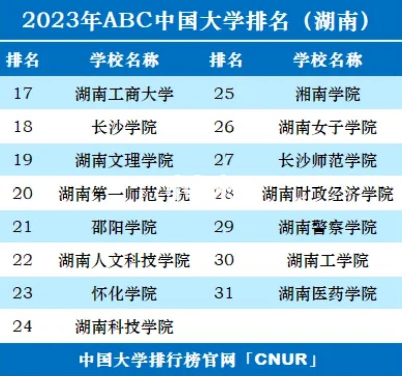 根据最新发布的2023年ABC中国大学排名,湖南省成绩斐然,共有31所高校荣登榜单。其中,中南大学、湖南大学、湖南师范大学、湘潭大学和湖南农业大学脱颖而出,分别位列前五名。