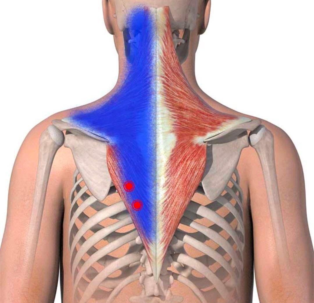触发点位置自下向上,肩胛内上角上方约1.3cm的位置;位于颈部和肩部的交界区;脊柱颈椎C4/C5水平至肌肉上。