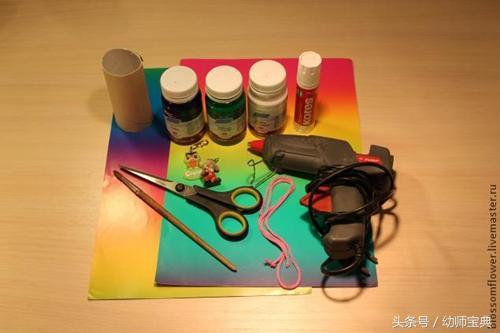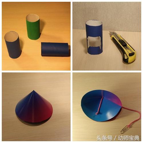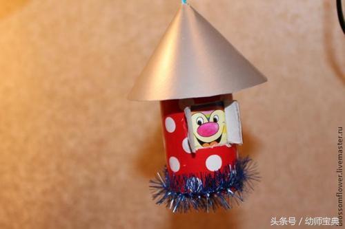材料准备:硬纸板,纸筒,颜料,彩纸,装饰物,碟子,曲别针,细绳