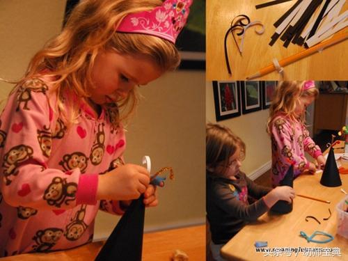 先用黑色硬纸板剪出一个扇形,并用胶水将其粘成圆锥的形状。然后在白色纸板上随意画出自己喜欢的形状,写上“新年快乐”的字样,将其剪下来,粘贴在圆锥帽子上。最后可以在帽子的顶部粘上羽毛、彩纸条、毛根,在帽子的底部边缘粘上亮片纸等进行装饰。这样,一个可爱的新年派对礼帽就做好了。