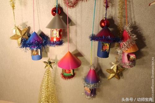 用颜料或彩纸对纸筒进行装饰。然后用手工刀在纸筒的中间位置开一扇“小窗”,并用剪刀修剪,使其看起来更美观。之后用硬纸板剪下一个圆,并将其粘成圆锥的形状,并将一根细绳固定在圆锥上用来悬挂。再将圆锥与纸筒粘合,把孩子的小玩具粘在纸筒里面。这样,小房子就做好了。用它来做新年装饰,美翻啦,有没有!