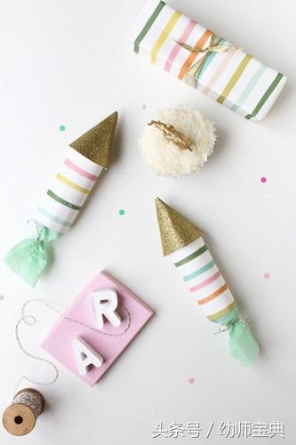 先用彩色硬纸板剪出矩形和扇形,然后剪下一段皱纹纸粘在矩形硬纸板的底边。之后将矩形和扇形硬纸板分别卷成圆柱和椎体,并粘合。用细绳将圆柱上皱纹纸的一侧系上,然后把棒棒糖、亮片纸、彩色碎纸片等填充物放进圆柱中,最后将椎体粘在圆柱的另一侧进行封口。这样,一个可爱的新年礼花就做好了。