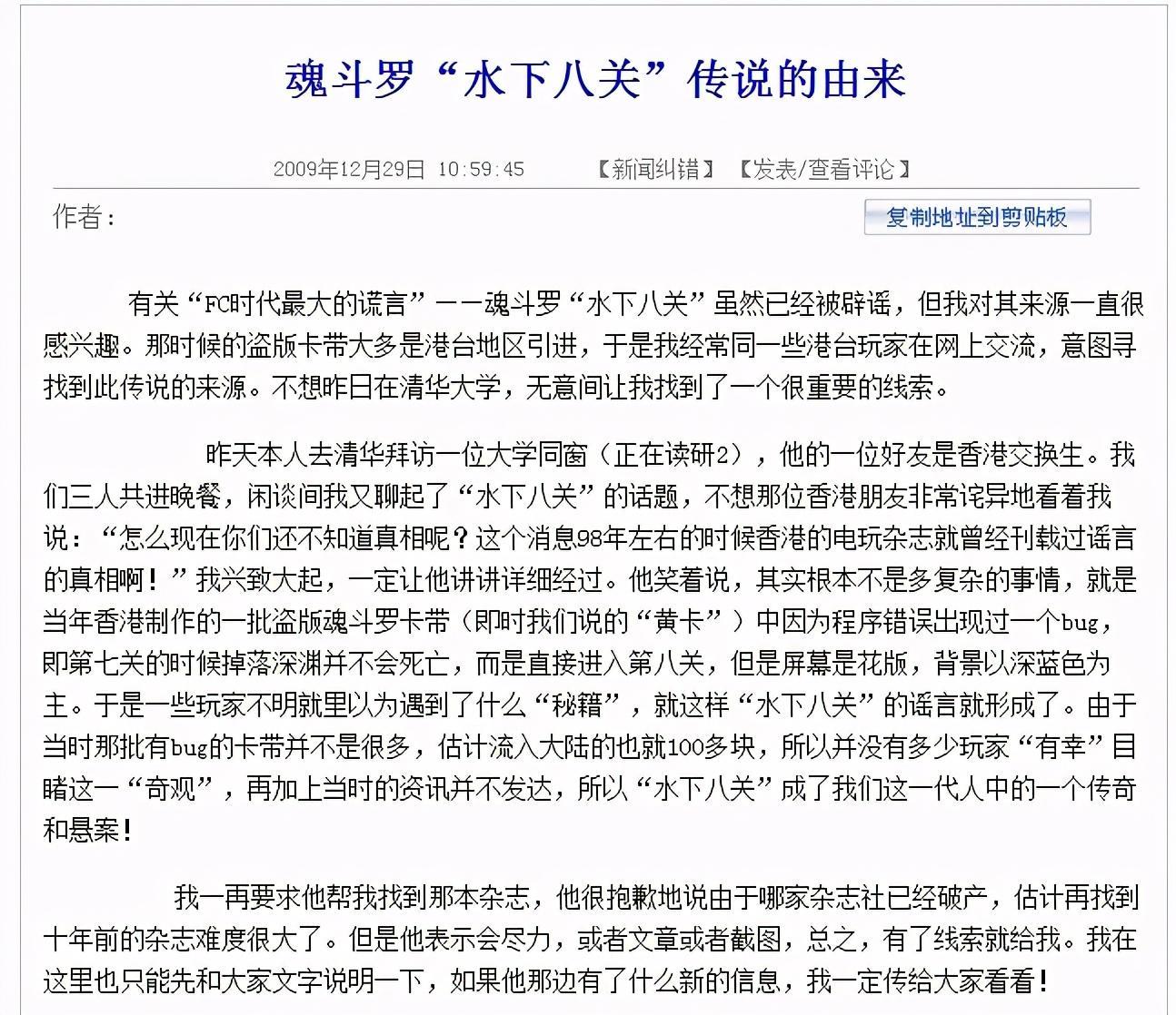 同样的,我们回到刚才那篇报道,内容显示是在第七关掉进深渊。就连百科“魂斗罗水下八关”词条也记录是在第六关。这样一来这个问题就很迷茫了。而柠檬菌也没有直接的证据证明那种说法其实真正的起源。