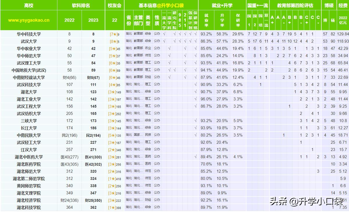 《软科》最新排名数据已经出炉,湖北省25所本科院校最新排名数据。华中科技大学在全国高校中排名第八,武汉大学排名第九,和上一年的排名保持一致。武汉大学和华中科技大学是位于湖北省的两所著名高等院校。