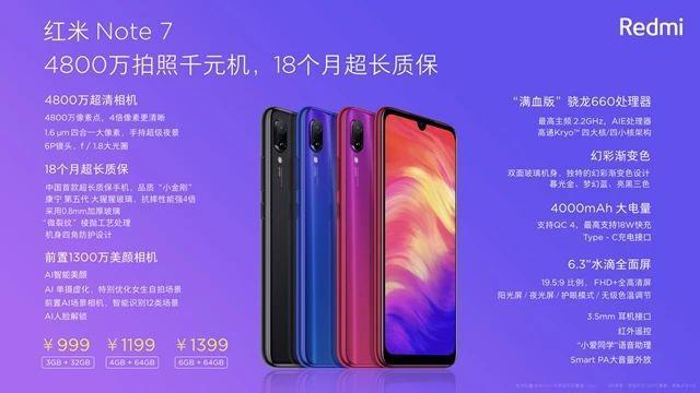另外,红米Note7采用了一块6.3英寸的水滴屏,支持护眼屏和阳光屏。搭载骁龙660处理器,前置摄像头为1300万像素,预留3.5mm耳机接口,采用渐变色。