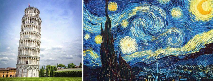 比萨斜塔是意大利比萨城大教堂的独立式钟楼,位于意大利托斯卡纳省比萨城北面的奇迹广场上。我们知道一般的建筑都是直立的,但是比萨斜塔却不同,它带着微微倾斜的角度,体现出独特的美感和人类高超的建筑技术。我们今天就用线条,来表现比萨斜塔的外形美和细节美,并通过结合梵高《星月夜》中星空的艺术感,以点的方式来表现美丽的背景,与画面主体形成鲜明的对比。