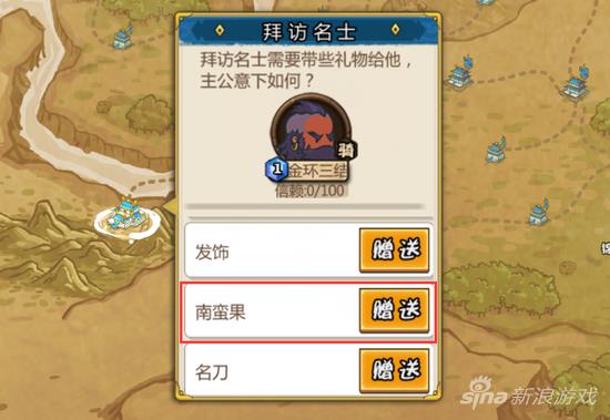 当玩家赠送了南蛮果以后,就能看到拜访名士成功的图片,这个图片就意味该道具获得了最高的信赖度。当玩家连续赠送3天以后,就能解锁金环三结这个武将。