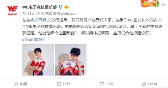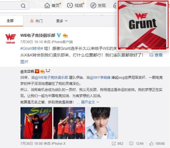 近日在WE电子竞技俱乐部的官方微博上,发布了一条关于grunt的消息,在消息中称“艺人文苡帆已正式加入西安曲江WE电子竞技俱乐部,并且未来也将继续用Grunt的ID随队出征”。恭喜文苡帆成为了现实版的Grunt。