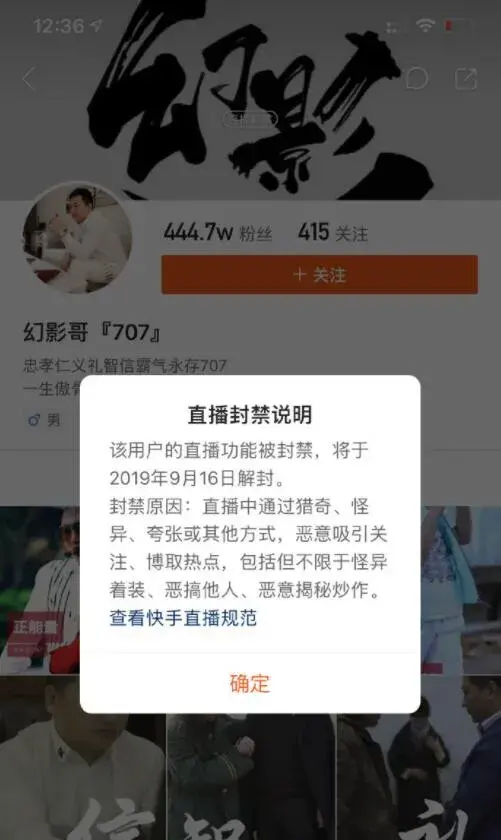 而到了晚上的时候幻影哥直播间被封,由于幻影哥挑理牌牌琦不随礼,目前直播权限被封一天。被封理由为“直播中通过猎奇、怪异、夸张或其它方式、恶意吸引关,博取热点,包括但不限于着装、恶搞他人、恶意揭秘炒作! 幻影哥也是非常冤枉。