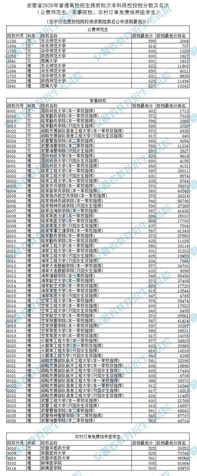 下面是安徽省和贵州省提前批院校投档分数线,包括军校、农村订单免费培养医学生,有兴趣的考生可参考!