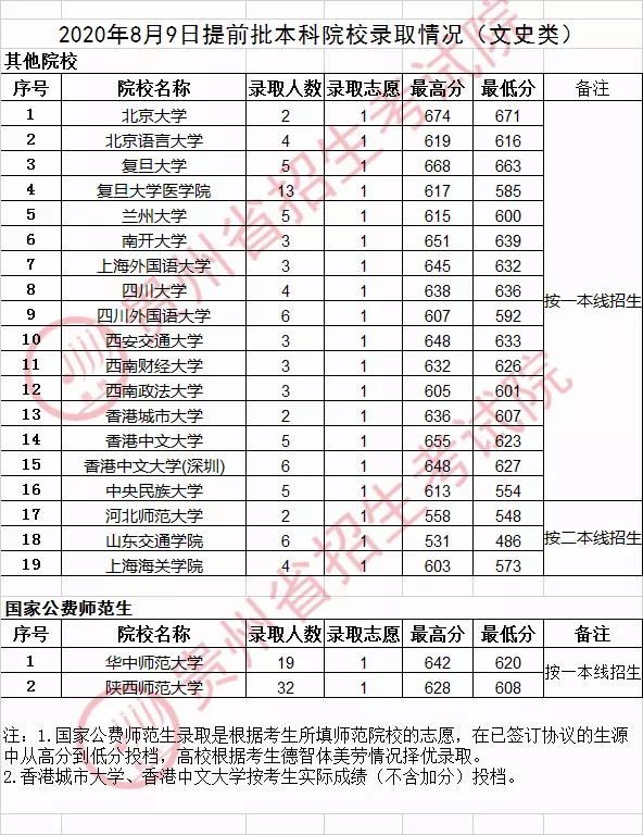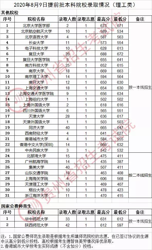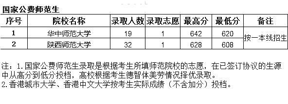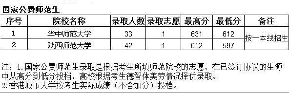 有两所公费师范生在贵州的投档分数线已经公布,一是华中师范大学,在贵州录取33人。理工类投档最高分631分,最低分612分。二是陕西师范大学录取42人。理工类投档最高分612分,最低分587分。这两所大学的投档分数线相差还是比较大的。
