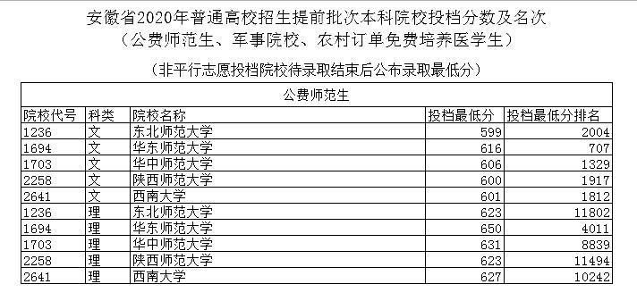 综合安徽省文理科投档分数线,华东师范大学最高,然后依次是华中师范大学、西南大学、陕西师范大学、东北师范大学。